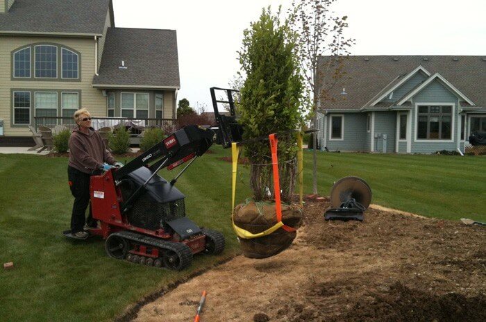 Then, in the spring of 2002, we received one of our first big garden construction projects and thought we could justify the expense of the Four Paw Dingo. We invested in a new Dingo with a power head, 30″ and 16″ augers, a materials bucket and a set of forks. On this project with rocky soil, we were able to dig 27, 30″ holes in 2 1/2 hours with one person. The auger placed the rock and soil evenly around the hole, which made it easy for backfilling after removing the few large rocks. Then we used the forks to unload the 6′ and 7′ evergreens. We continued to use that Toro until 2008 when we decided to sell our company in Pennsylvania to move back to the Midwest.